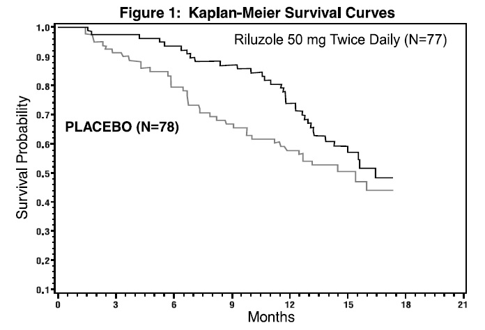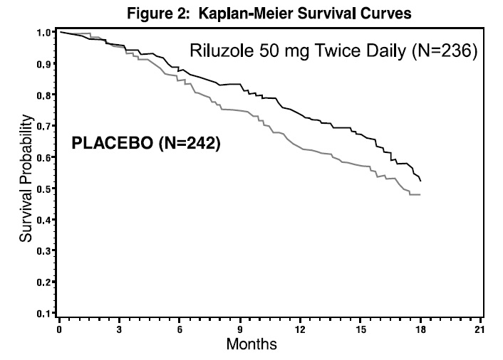 The text describes a figure titled "Kaplan-Meier Survival Curves", presenting survival probability data for Riluzole 50 mg Twice Daily (N=236) and Placebo (N=242).*