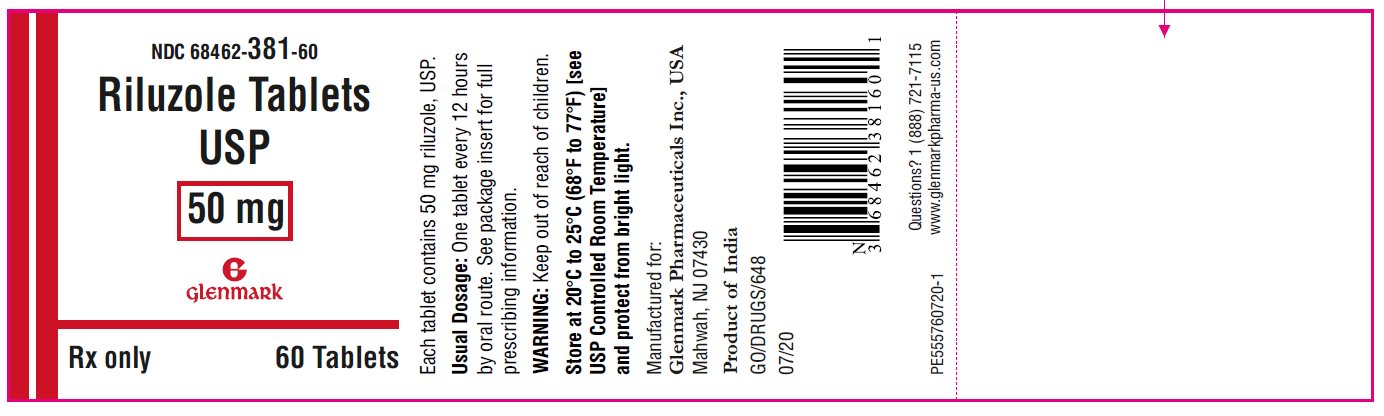 The following 5 images provide visual information about the product associated with Riluzole NDC 68462-381 by Glenmark Pharmaceuticals Inc., Usa, such as packaging, labeling, and the appearance of the drug itself. This resource could be helpful for medical professionals, pharmacists, and patients seeking to verify medication information and ensure they have the correct product.