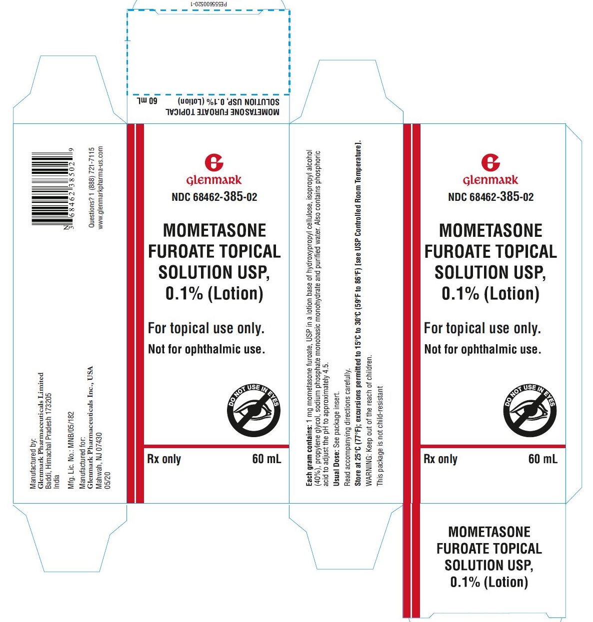 The following 5 images provide visual information about the product associated with Mometasone Furoate NDC 68462-385 by Glenmark Pharmaceuticals Inc., Usa, such as packaging, labeling, and the appearance of the drug itself. This resource could be helpful for medical professionals, pharmacists, and patients seeking to verify medication information and ensure they have the correct product.