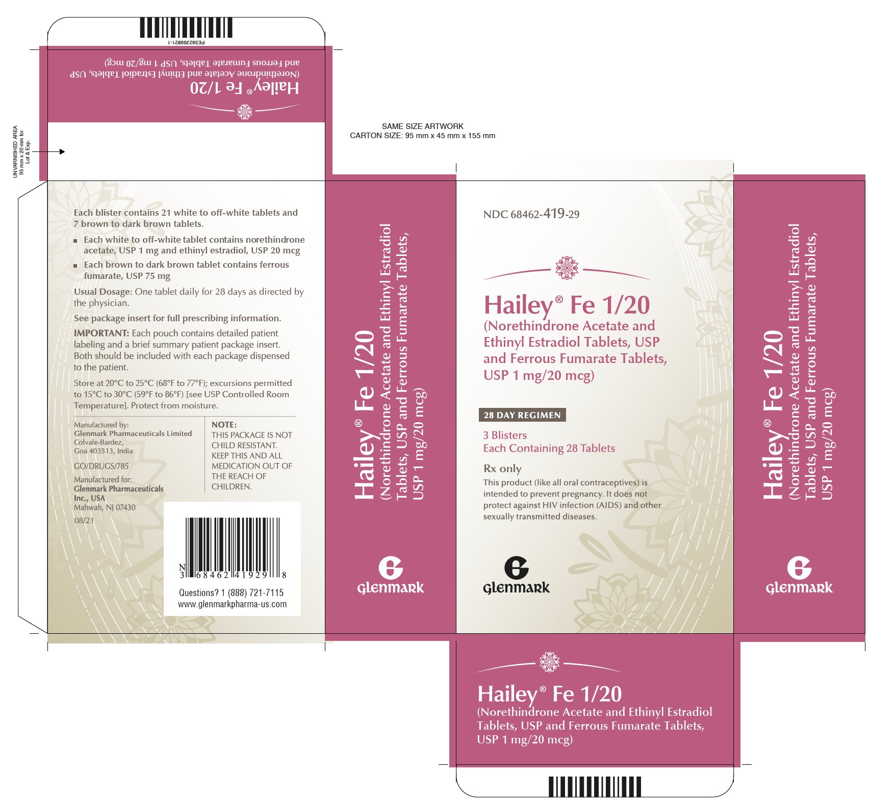 The following 9 images provide visual information about the product associated with Hailey Fe 1/20 NDC 68462-419 by Glenmark Pharmaceuticals Inc., Usa, such as packaging, labeling, and the appearance of the drug itself. This resource could be helpful for medical professionals, pharmacists, and patients seeking to verify medication information and ensure they have the correct product.