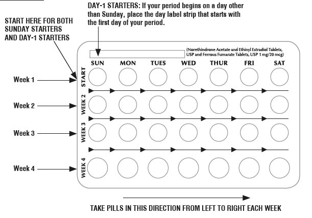 This text seems to be a set of instructions for women who want to start taking birth control pills. If their period begins on a day other than Sunday, they need to place a label strip that starts with "START HERE FOR BOTH the first day of your period". However, if their period starts on Sunday, they can follow the instructions for Sunday starters. The text includes a table with week numbers and corresponding days when the pills need to be taken. The pills should be taken in a left to right direction each week.*