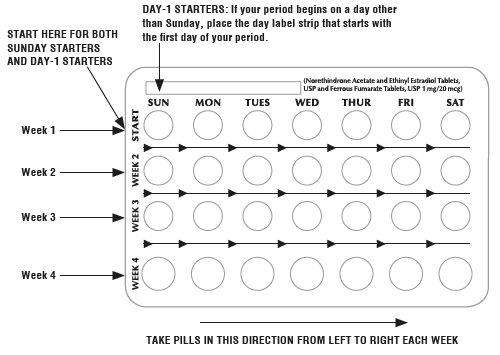 This text is a set of instructions for a birth control pill pack. It outlines how to start the pill pack depending on the first day of the menstrual cycle - either on a Sunday or any other day. The text also provides a day label strip and shows how to take the pills each week.*