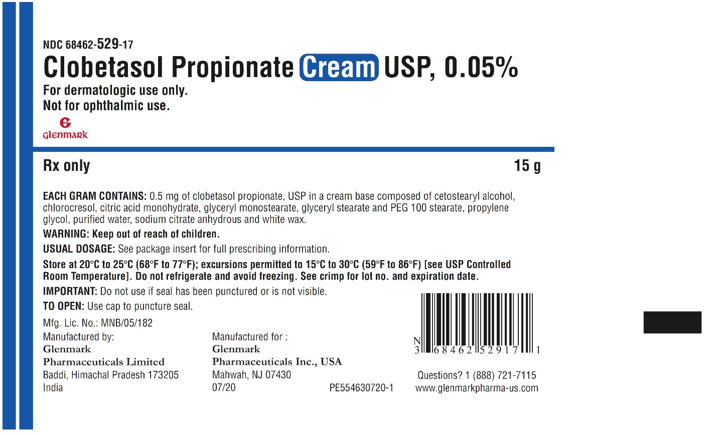 This is a description of a medication with the National Drug Code 68462-529-17. The medication is a cream containing 0.5 mg of clobetasol propionate USP, and is for dermatologic use only, not for ophthalmic use. The cream composition contains several ingredients. The medication should be stored at 20°C to 25°C (68°F to 77°F) and kept away from children. The dosage information can be found in the package insert, and the medication should not be used if the seal has been broken or is not visible. The medication is manufactured by Glenmark Pharmaceuticals Limited in Baddi, Himachal Pradesh, India, and is distributed by Glenmark Pharmaceuticals Inc., Mahwah, NJ, USA.*
