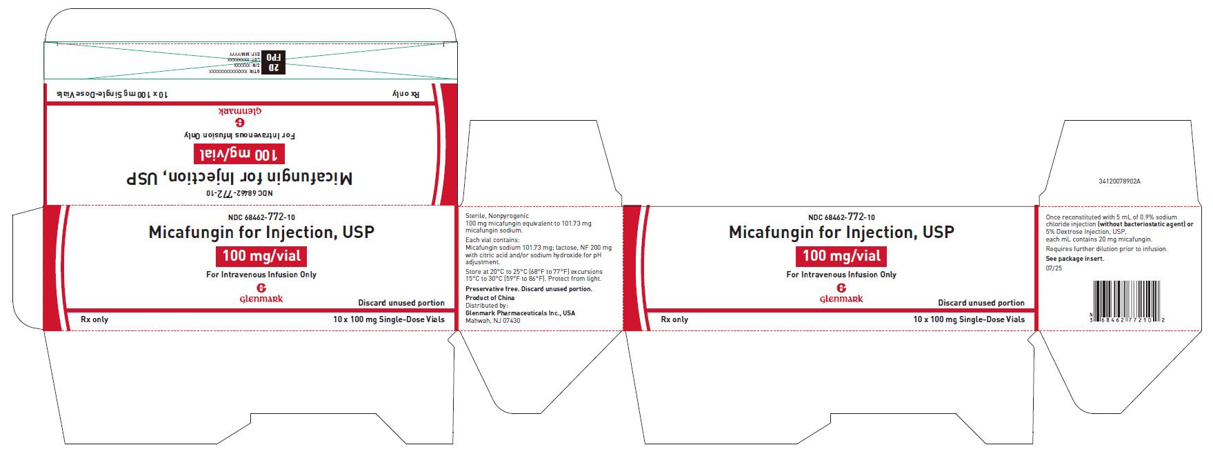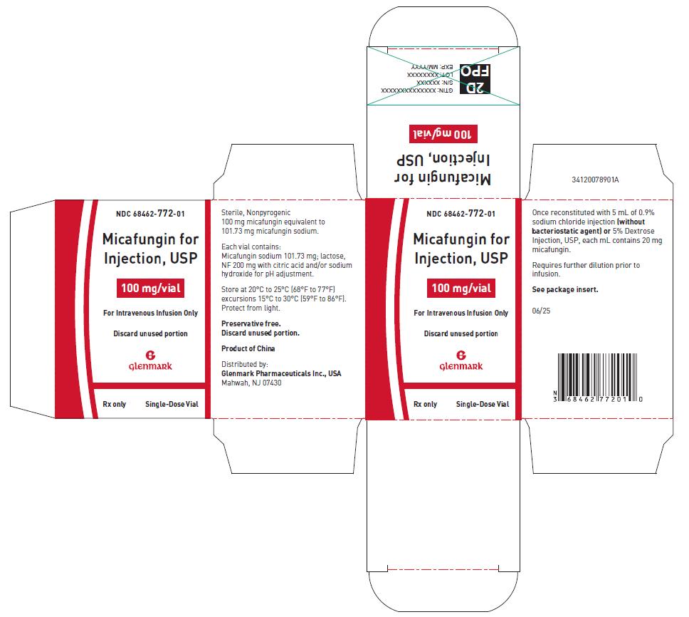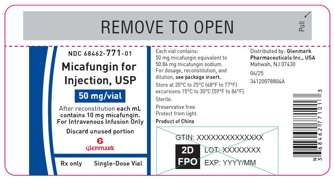 The following 7 images provide visual information about the product associated with Micafungin NDC 68462-771 by Glenmark Pharmaceuticals Inc., Usa, such as packaging, labeling, and the appearance of the drug itself. This resource could be helpful for medical professionals, pharmacists, and patients seeking to verify medication information and ensure they have the correct product.