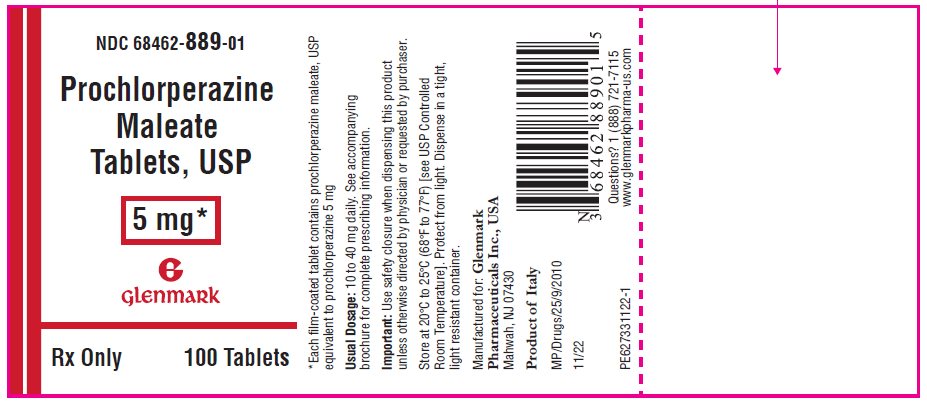 This is a medication called Prochlorperazine Maleate, in the form of tablets. The NDC number is 68462-889-01 and the manufacturer is Glenmark. It is a prescription drug with 100 tablets per bottle.*