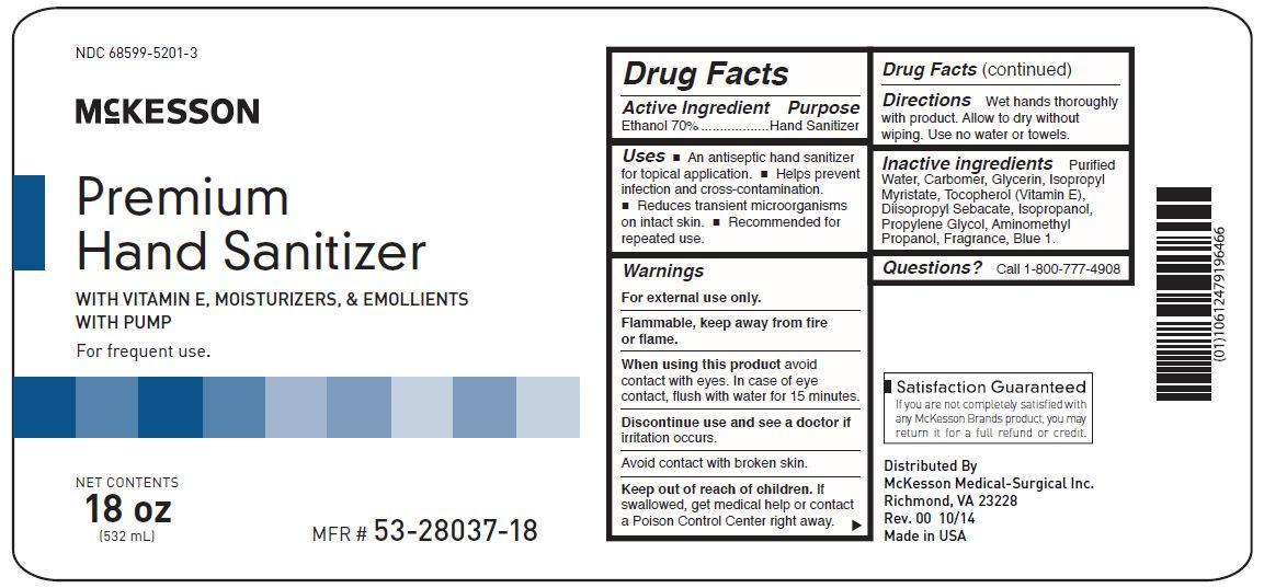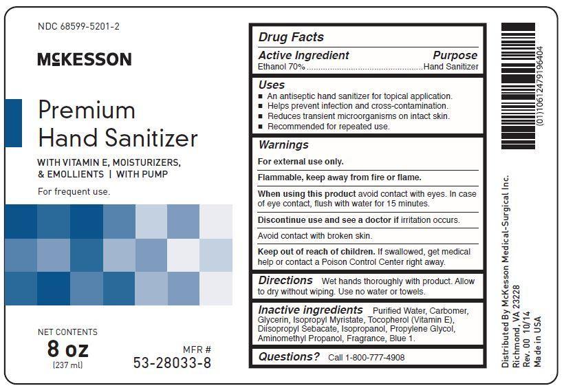 The following 4 images provide visual information about the product associated with Premium Hand Sanitizer NDC 68599-5201 by Mckesson Medical-surgical Inc., such as packaging, labeling, and the appearance of the drug itself. This resource could be helpful for medical professionals, pharmacists, and patients seeking to verify medication information and ensure they have the correct product.