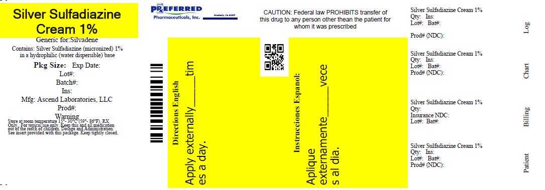 This is a description of a Silver Sulfadiazine Cream 1% which is also known as Silvadene. It contains micronized Silver Sulfadiazine and is in a hydrophilic (water-dispersible) base. It is manufactured by Ascend Laboratories, LLC and comes in different sizes and batches. The cream is to be applied externally twice a day. There are cautionary instructions in English and Spanish that warn against transferring the drug to anyone other than the patient for whom it was prescribed. It has an NDC (National Drug Code) number which is used for insurance and billing purposes.*