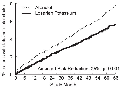 This text provides information comparing the risk reduction of Atenolol and Losartan Potassium, with an adjusted risk reduction of 25% and a p-value of 0.001. It also shows the percentage of patients with fatal/non-fatal stroke across different study months from 6 to 66.*