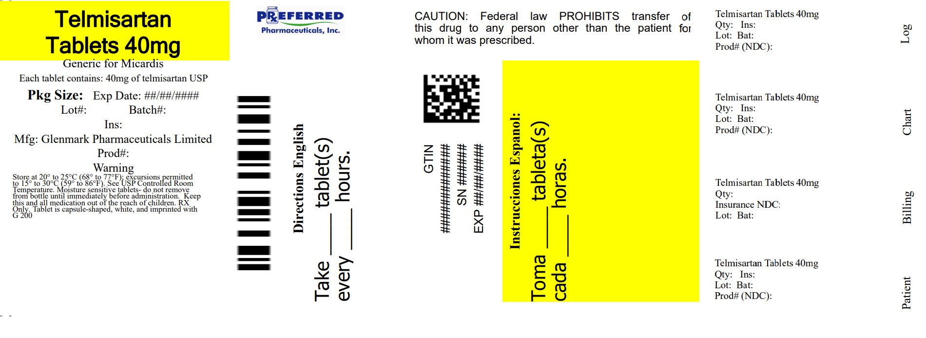 This text seems to be a description of Telmisartan tablets in 40mg dosage. It mentions caution regarding the transfer of this drug as per Federal law. The tablets are described as generic for Micardis and each tablet contains 40mg of telmisartan USP. The manufacturer is Glenmark Pharmaceuticals Limited. The tablets are advised to be stored at 20° to 25°C. They are moisture-sensitive, so shouldn't be removed from the bottle until just before administration. The tablets are white and capsule-shaped, imprinted with "G200". It also advises keeping the medication out of reach of children.*