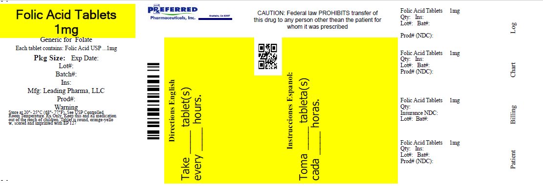 This is a description of Folic Acid Tablets, with a caution regarding its transfer and a note that federal law prohibits its transfer. It is recommended for individuals who were prescribed the medication. Each tablet contains 1mg of Folic Acid, and it is the generic version of Folate Frodt. The product is manufactured by Leading Pharma LLC. The rest of the text appears to be a mix of codes and is not useful.*