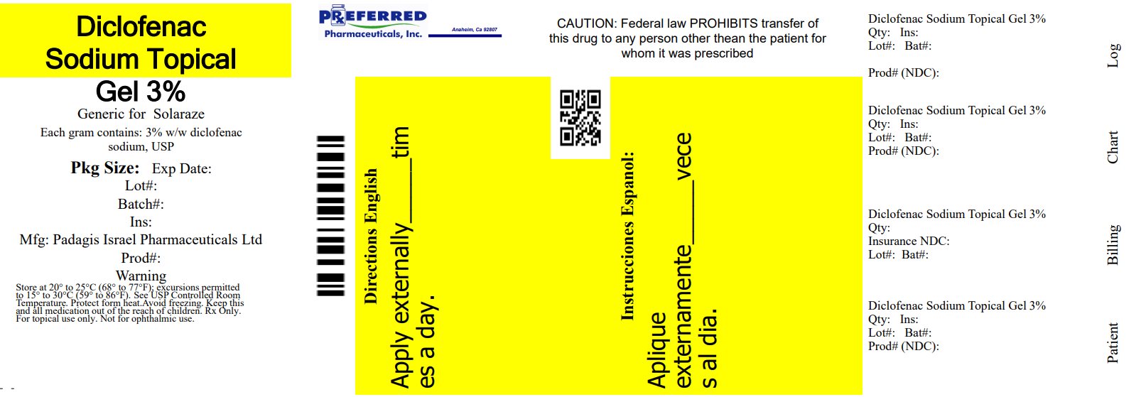 This is a medication description for Diclofenac Sodium Topical Gel 3%. It is a generic version of Solaraze and each gram contains 3% of sodium USP. The manufacturing company is Padagis Israel Pharmaceuticals Ltd. The medication is meant for topical use only, and not for ophthalmic use. The label includes information on storage temperatures and precautions to keep it out of reach of children. The warning section emphasizes that it should only be used by the patient for whom it was prescribed. There are various product numbers and lot numbers listed on the label, likely for inventory and tracking purposes.*