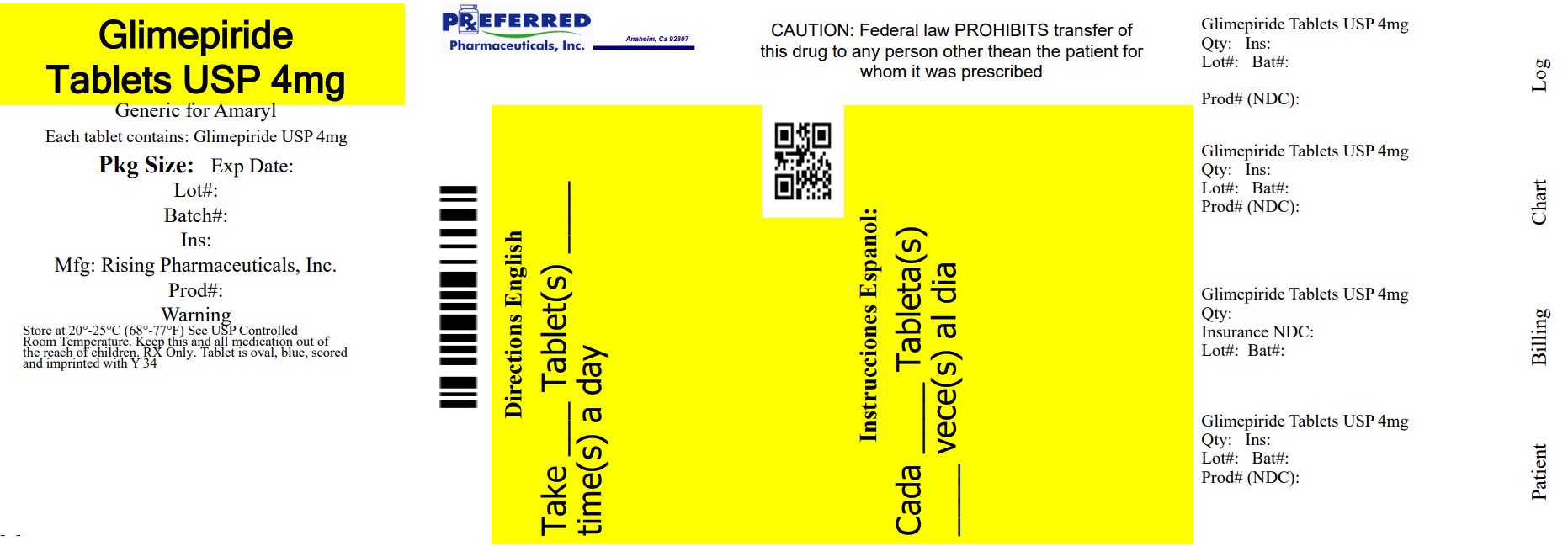This is a medication label for Glimepiride Tablets USP 4mg, a generic version of Amaryl. The tablets are oval, blue, and scored, with imprinted Y 34. They should be taken orally as directed, not transferred to another person, and stored at 20°-25°C. The label also includes details such as package size, expiration date, lot and batch number, manufacturer (Rising Pharmaceuticals, Inc.), and instructions in English and Spanish. There is a chart log and billing information for the patient.*