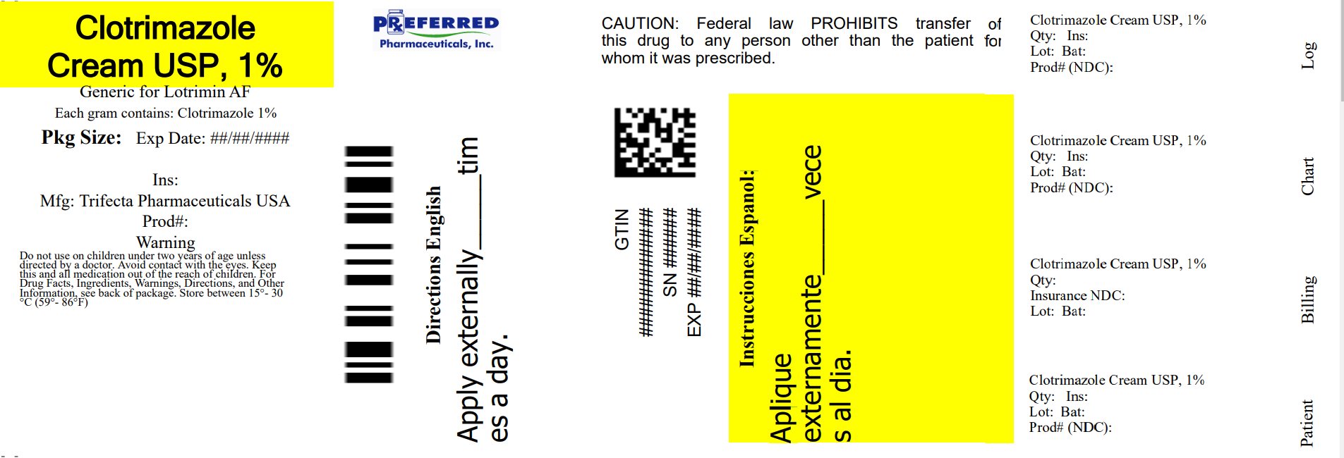 This is information about Clotrimazole Cream USP, 1%, a generic for Lotrimin AF. Each gram contains 1% Clotrimazole. It is manufactured by Trifecta Pharmaceuticals USA. The directions in English suggest applying externally twice a day. The product should be stored between 15°-30°. There are also instructions in Spanish. The package size and expiration date are not available.*