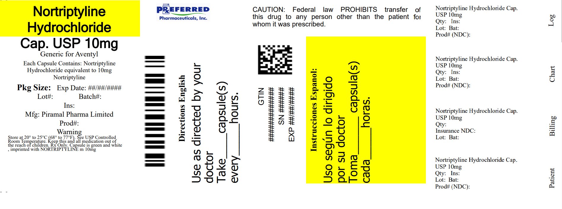 This is a description of a medication called Nortriptyline Hydrochloride Cap 10mg, which is a generic version of Aventyl. The text emphasizes the caution regarding the federal law that prohibits the transfer of this drug to anyone other than the patient it was prescribed for. It includes details such as the manufacturer (Piramal Pharma Limited), store conditions (20°C to 25°C), how to keep the medication out of reach of children, and the appearance of the capsule (green and white with imprint NORTRIPTYLINE 10mg).*