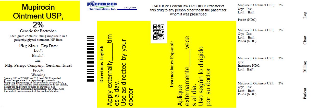 Maupiocia Ointment USP is a generic alternative to Bactroban containing 20mg of mupiocia per gram of polyetylglycol ointment. It is cautioned that this drug cannot be transferred to any person other than the patient it was prescribed for, as per federal law. The product is manufactured by Perrigo Company in Yeruham, Israel. The expiration date and lot number are indicated on the package, and cautionary notes are provided on the drug label.*