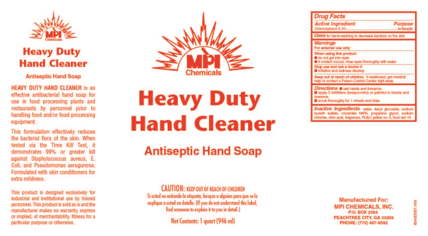 Heavy Duty Hand Cleaner is an antiseptic soap primarily used in food processing plants and restaurants by personnel before handling food and food processing equipment. It is formulated to reduce bacterial flora on the skin and has shown a 99% or greater kill rate against bacteria such as Staphylococcus aureus, E. coli, and Pseudomonas aeruginosa. The product includes skin conditioners for mildness. The caution label advises keeping the product away from children, seeking medical attention in case of ingestion, and contacting Poison Control Center if needed. The product comes in the wet contents of one quart (946 ml). The product is manufactured for MPI CHEMICALS, INC., Peachtree City, GA, USA.*