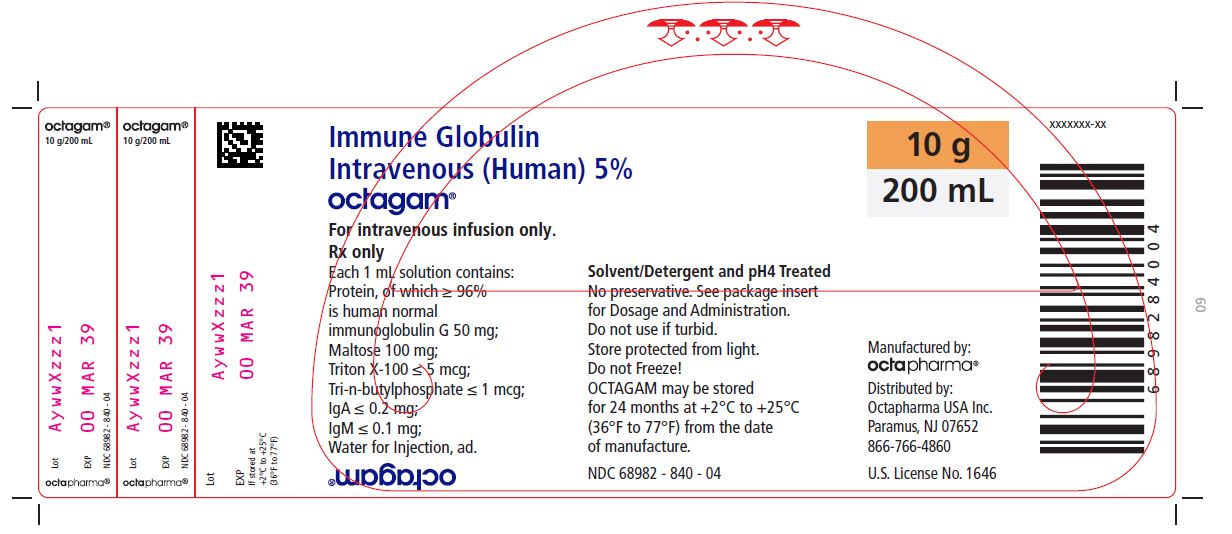 This appears to be a description of a medication called OCTAGAM, which is a protein supplement with human normal immunoglobulin G that comes in a 200 mL bottle. It is treated with Solvent and Detergent and has a pH of 4, and should not be used if it appears turbid. The medication is manufactured and distributed by Octapharma, and has an NDC number of 68982-840-04. Dosage and administration information can be found in the package insert. The medication should be stored in a protected place away from light and should not be frozen.*