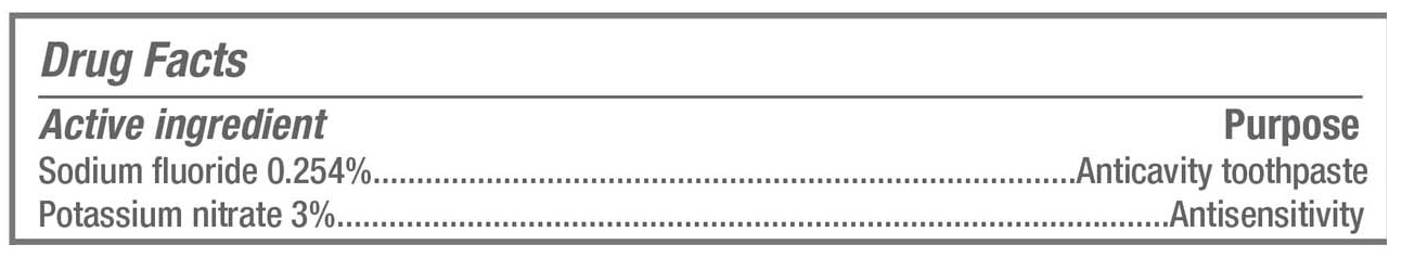This is a drug facts label for a toothpaste. The active ingredients are Sodii ATOrdEI02DAY05sx0mssnsconsmssssssmmmmsmmmmassesstsssmmssssaisssssssssasss, which functions as an anticavity agent, and Potassium nitrate 3%, which serves as an antisensitivity agent.*