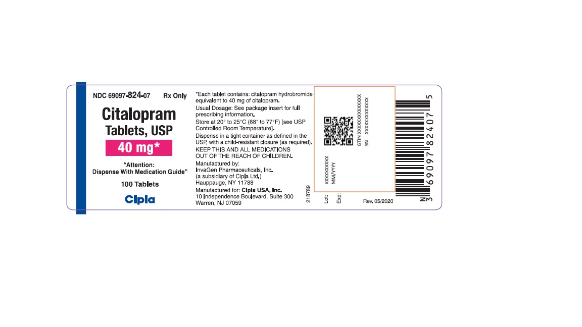 This is a medication with the NDC code 69097-823-07, only available by prescription. It contains citalopram hydrobromide with each tablet having an equivalent of 20 mg of citalopram. The recommended dosage is described in the package insert. The tablets should be stored between 20° to 25°C. The medication should be kept out of reach of children in a tight container with child-resistant closure. The manufacturer is InvaGen Pharmaceuticals, Inc., a subsidiary of Cipla Ltd., located in Hauppauge, NY 11785. The medication guide must be dispensed with the medication.*