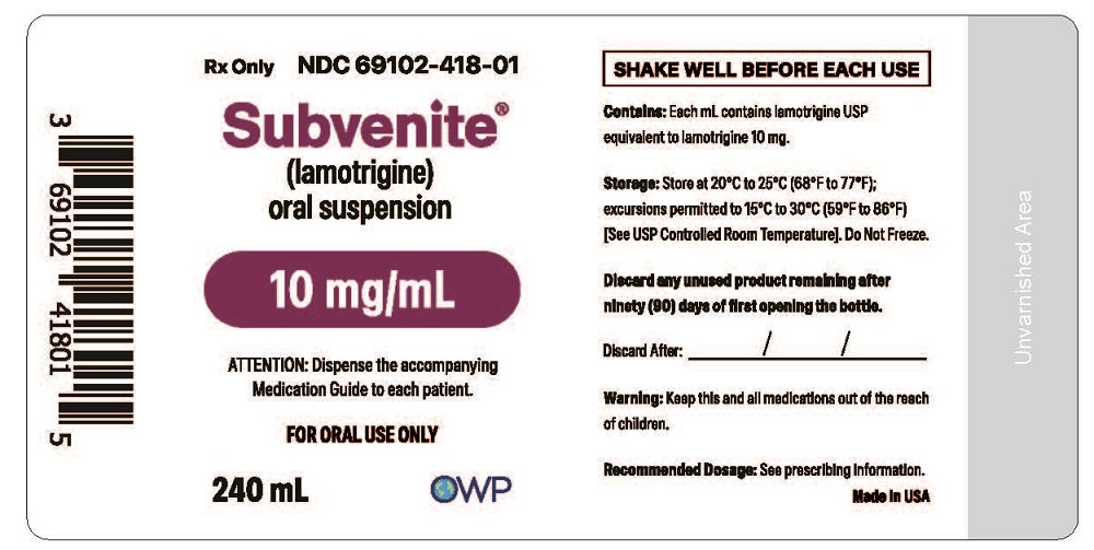 This is a description of a medication called "Subvenite" (lamotrigine) oral suspension. Each mL contains lamotrigine USP equivalent to 10mg of lamotrigine. It is for oral use only and should be shaken well before each use. The medication guide should be given to each patient. The storage temperature should be between 20°C to 25°C (68°F to 77°F) with excursions permitted to 15°C to 30°C (59°F to 86°F). Unused product should be discarded after ninety days of first opening the bottle. Additionally, a warning is given to keep this and all medications out of the reach of children. The recommended dosage information should be consulted for details. Made in the USA.*
