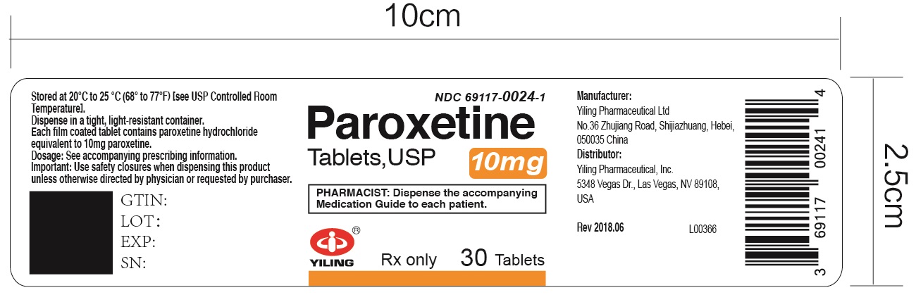 This is a description of a medication called Paroxetine, which comes in film-coated tablets. Each tablet contains 10mg of Paroxetine hydrochloride. The text provides instructions to store the medication between 20°C and 25°C and dispense in a light-resistant container. The NDC number is 69117-0024-4, and the medication should be distributed with the accompanying medication guide. The text also shows the name and address of the manufacturer and distributor.*