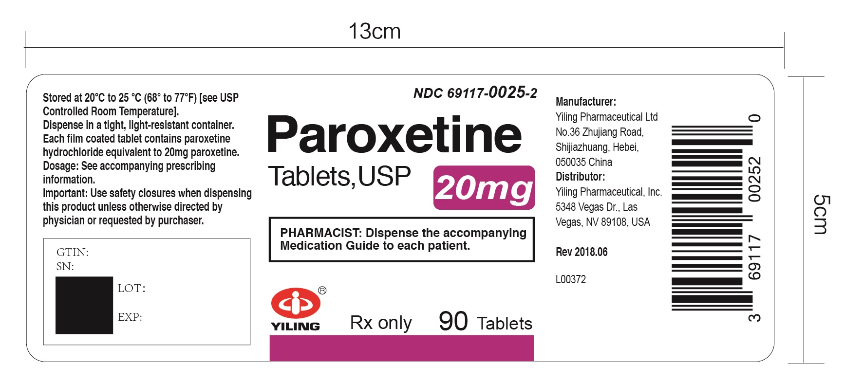 Each film coated tablet of Paroxetine contains 20mg of paroxetine hydrochloride. The medication should be stored at a temperature of 20°C to 25°C and dispensed in a tightly closed, light-resistant container. A pharmacist must dispense the medication guide to each patient. Additionally, the product must be dispensed with safety closures unless otherwise directed by a physician or upon the request of the purchaser. The GTIN, LOT, EXP, and SN are also provided in the text. Lastly, the manufacturer is Yiing Pharmaceutical Lid, and the distributor is Yiing Pharmaceutical, Inc. located in Las Vegas, NV.*