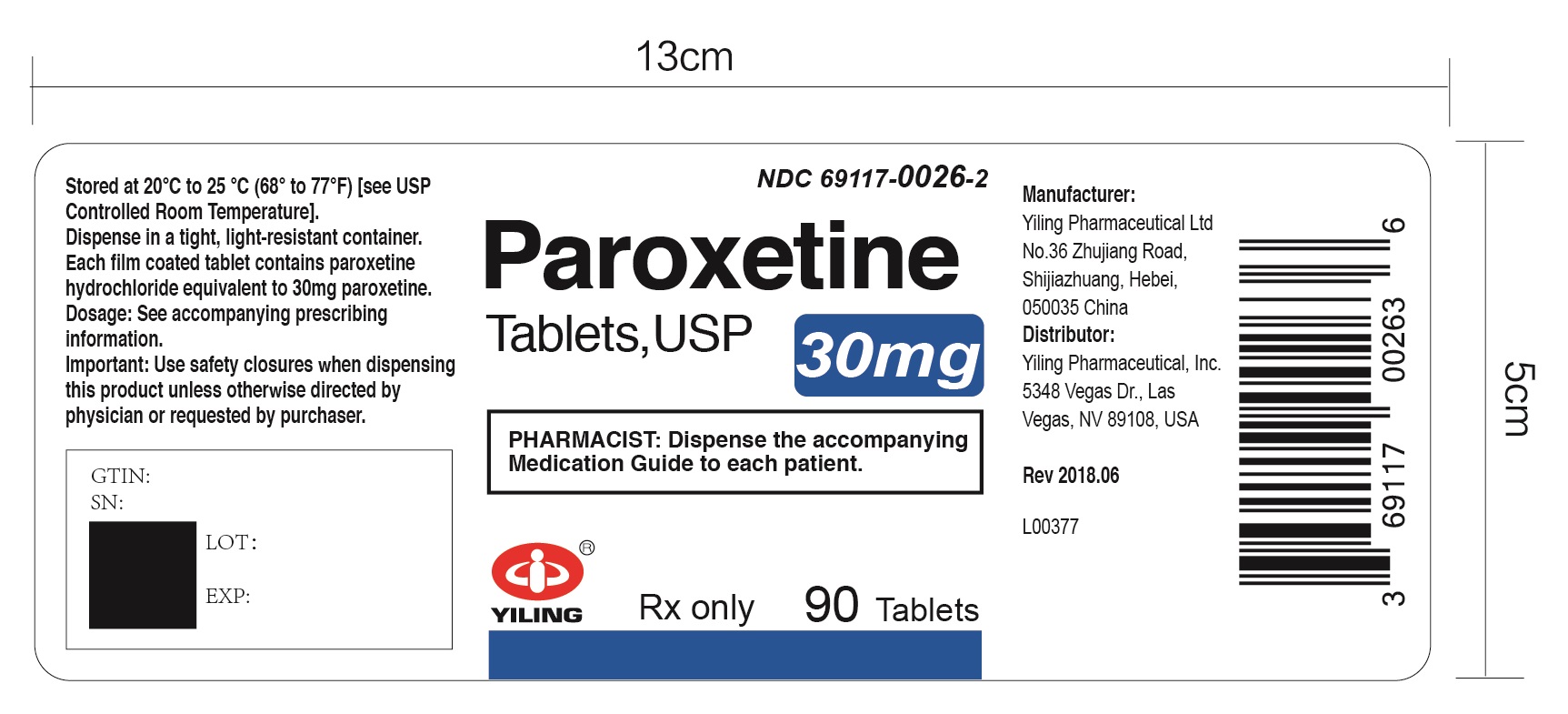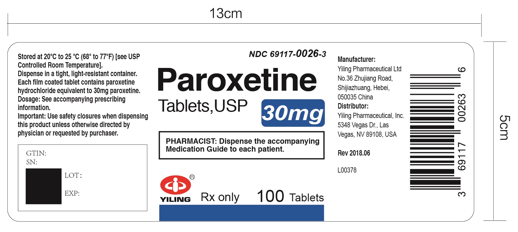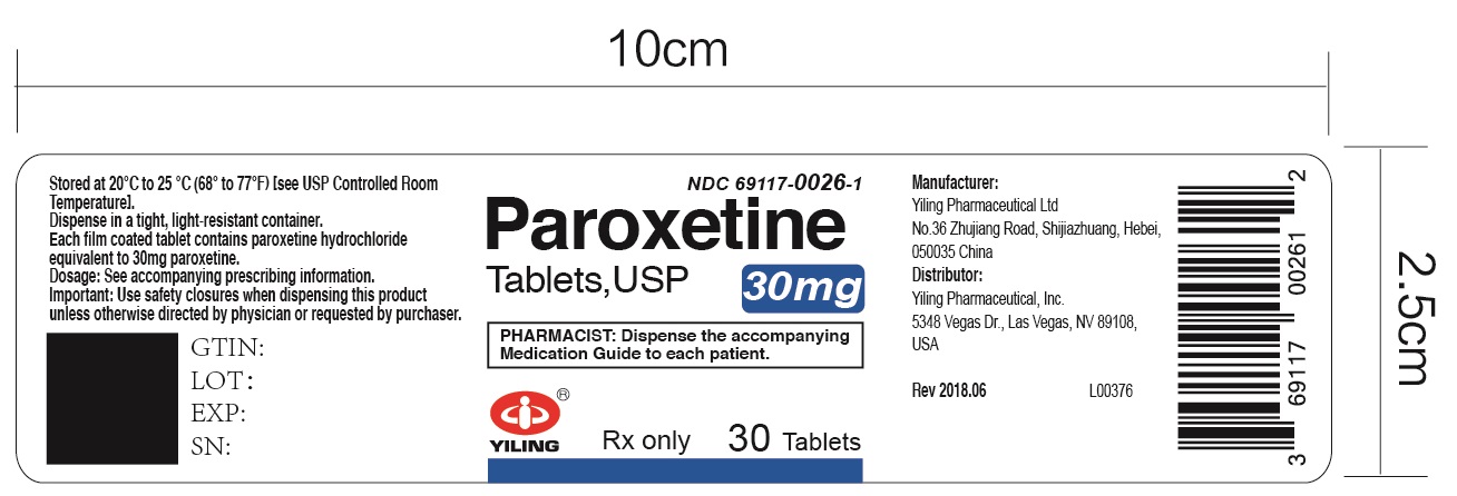 This is a description of Paroxetine tablets manufactured by Yiling Pharmaceutical Ltd with each film-coated tablet containing paroxetine hydrochloride equivalent to 30mg paroxetine. The tablets should be stored at 20°C to 25°C and dispensed in a tight, light-resistant container. The dosage information is available in the accompanying prescribing information, and the medication should be dispensed with a safety closure. The text includes manufacturer and distributor details, as well as GTIN, SN, LOT, and EXP numbers, and the important note to dispense the accompanying medication guide to each patient.*