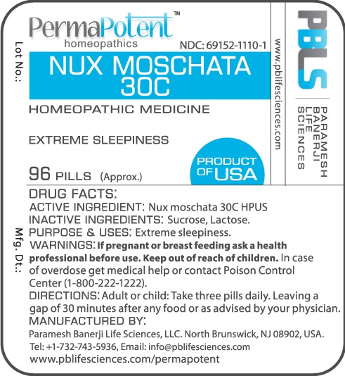 The following image provide visual information about the product associated with Nux Moschata 30c NDC 69152-1110 by Paramesh Banerji Life Sciences Llc, such as packaging, labeling, and the appearance of the drug itself. This resource could be helpful for medical professionals, pharmacists, and patients seeking to verify medication information and ensure they have the correct product.