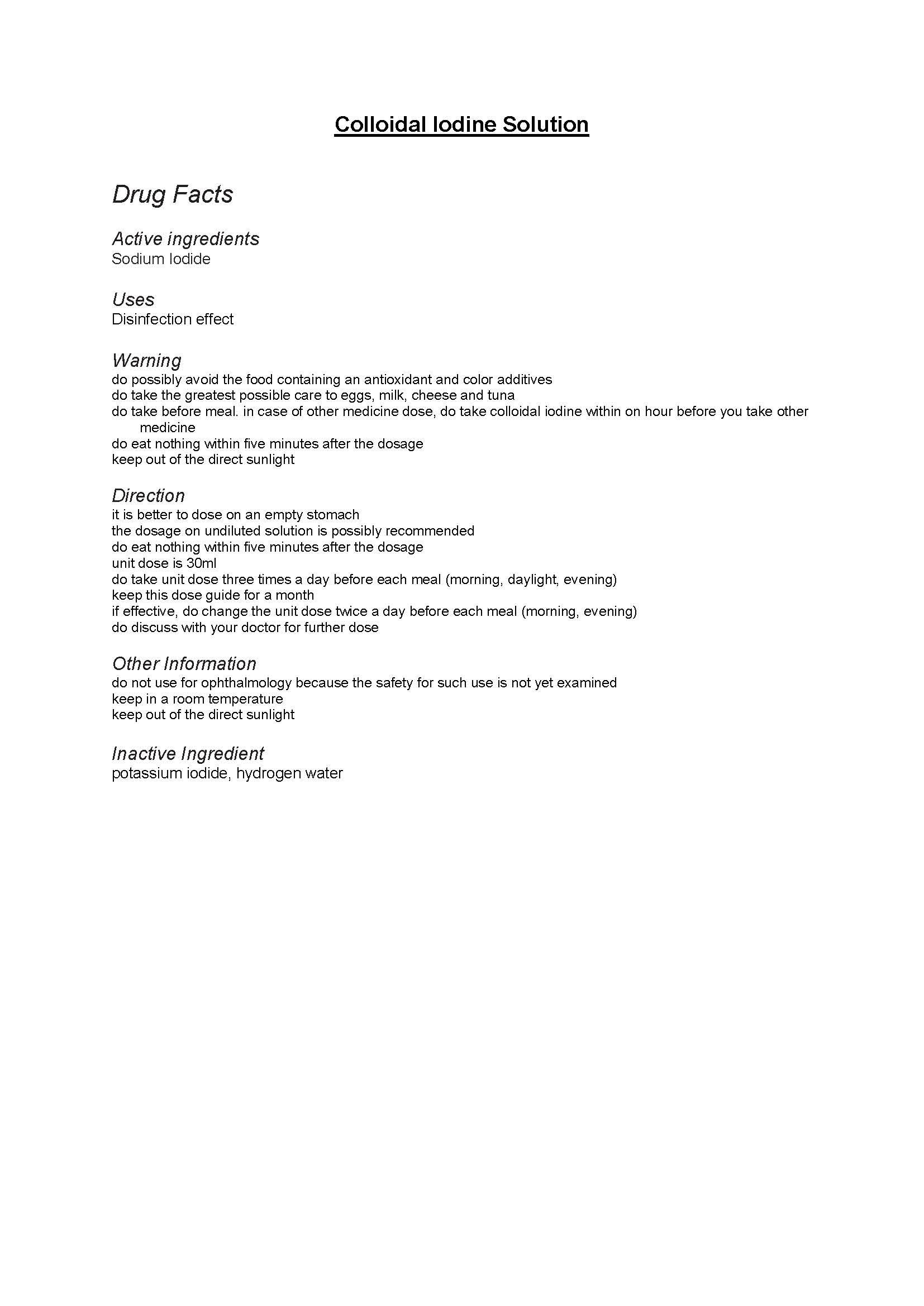 This is a description for a Colloidal Iodine Solution used for disinfection purposes. The active ingredient is Sodium lodide. The product comes with several warnings such as avoiding certain foods, taking it before meals, and not using it for ophthalmology purposes. The recommended dosage is 30ml, and it's advised to take this dose three times a day before meals. The solution should be kept at room temperature, away from direct sunlight. Additionally, there are inactive ingredients such as potassium iodide and hydrogen water.*
