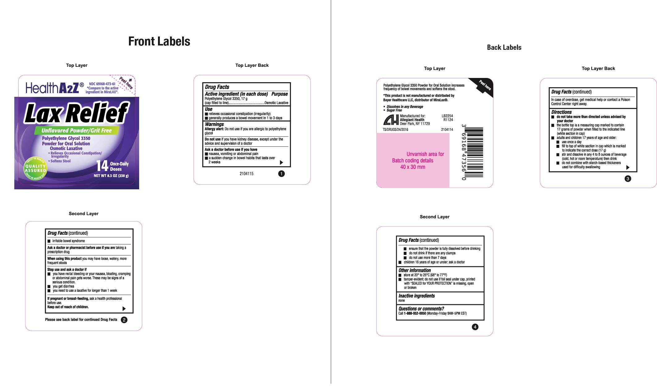 The following 2 images provide visual information about the product associated with Polyethylene Gycol 3350 NDC 69168-473 by Allegiant Health, such as packaging, labeling, and the appearance of the drug itself. This resource could be helpful for medical professionals, pharmacists, and patients seeking to verify medication information and ensure they have the correct product.