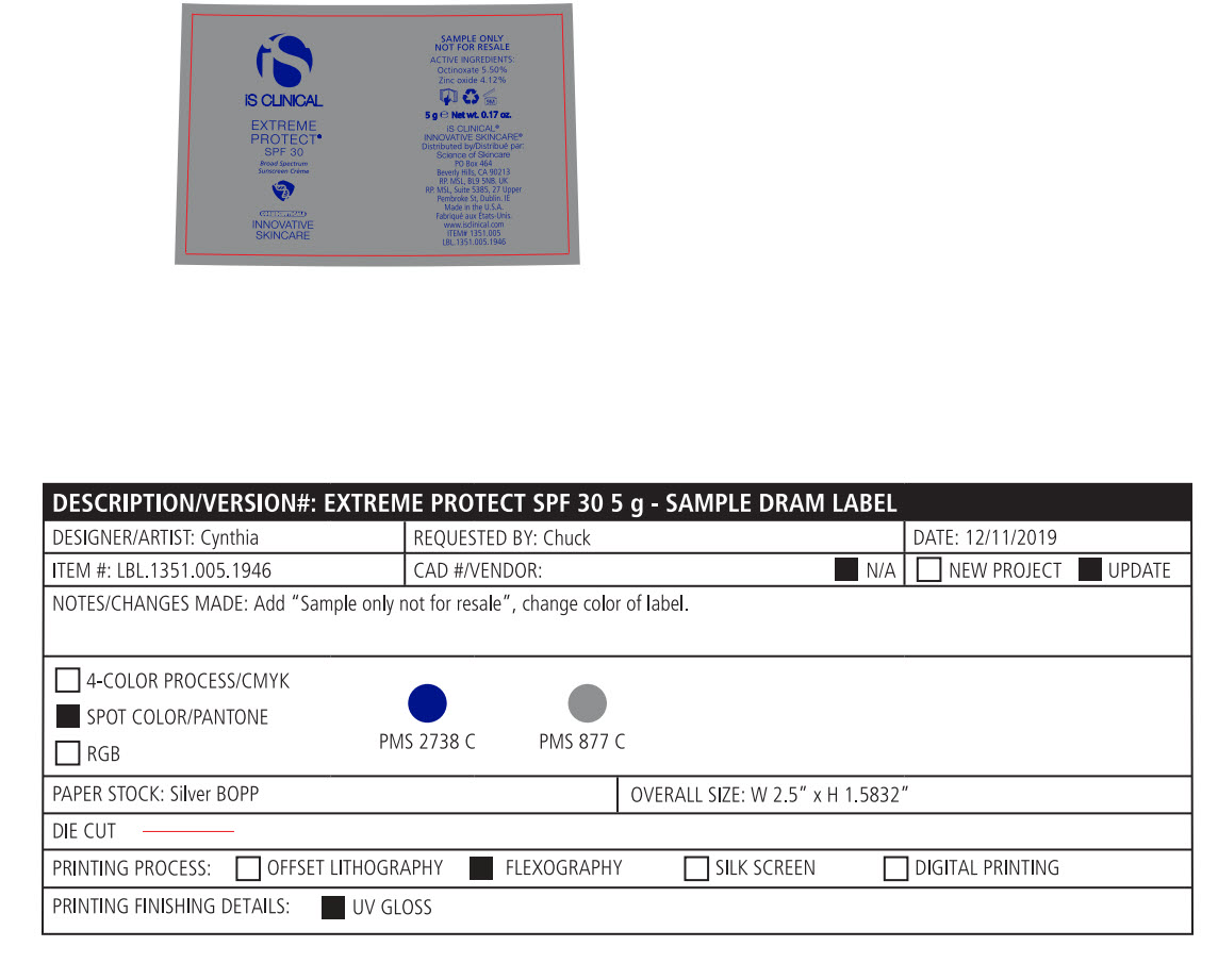 This is a label design for a product called "Extreme Protect SPF 30" with a sample size of 5g. The label includes information about not for resale and the change in color. The print process includes four-color process/CMYK or two spot colors with Pantone 2738C and 877C. The label is printed on a silver BOPP paper stock and has an overall size of W 2.5" x H 1.5832". Different printing processes and finishing details are also given, and the final finish is UV gloss.*