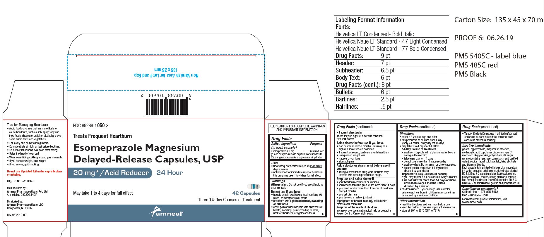 This is a product description for Esomeprazole Magnesium Delayed-Release Capsules, which is used to treat frequent heartburn. The product is sold in a 24-hour pack and has the National Drug Code (NDC) of 69238-1050-4. There are some unclear characters and random numbers at the end of the text.*