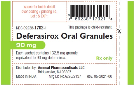 This package contains Deferasirox Oral Granules with each sachet containing 132.5 mg granules equivalent to 90 mg deferasirox. It is child-resistant and distributed by Amneal Pharmaceuticals LLC. The package has a lot number and NDC code, and it is made in India. However, there is no available information regarding "space for batch detail" or "over coding/printing L."*