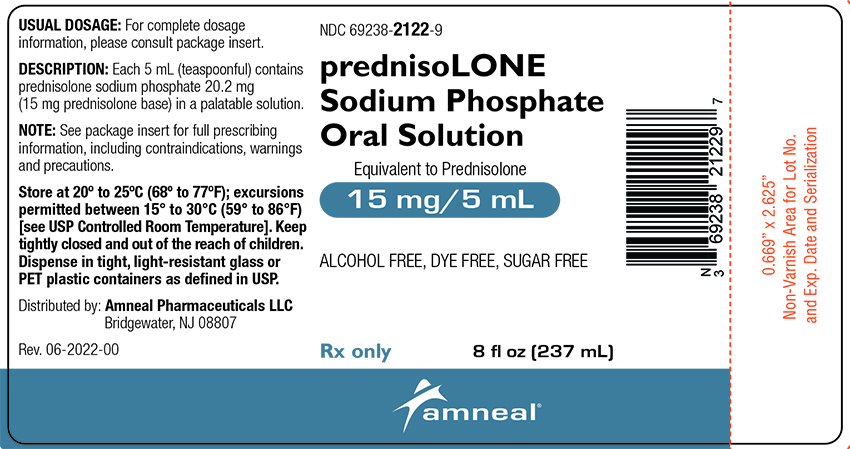 The following 2 images provide visual information about the product associated with Prednisolone Sodium Phosphate NDC 69238-2122 by Amneal Pharmaceuticals Ny Llc, such as packaging, labeling, and the appearance of the drug itself. This resource could be helpful for medical professionals, pharmacists, and patients seeking to verify medication information and ensure they have the correct product.