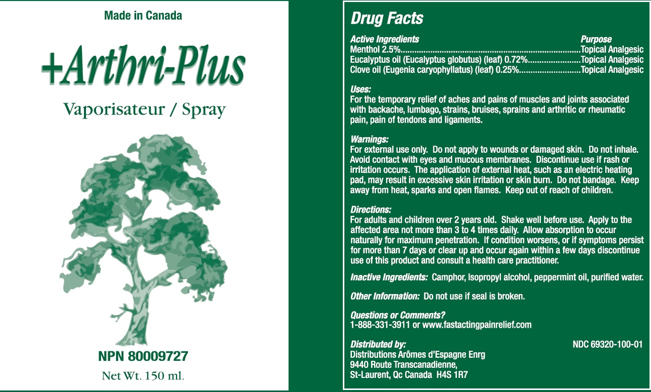 Arthri-Plus Vaporisateur Spray is a topical analgesic used for relieving pain and aches associated with backache, lumbago, strains, bruises, sprains, arthritic or rheumatic pain, pain of tendons and ligaments. Its active ingredients include Clove oil, Menthol, and Eucalyptus oil. The spray should not be used on eyes and mucous membranes. It should not be bandaged, and one should keep it away from heat, sparks and open flames. The product should not be used more than 3-4 times a day unless recommended by a healthcare practitioner. If irritation occurs, one should discontinue use. This product is not available for non-English characters.*