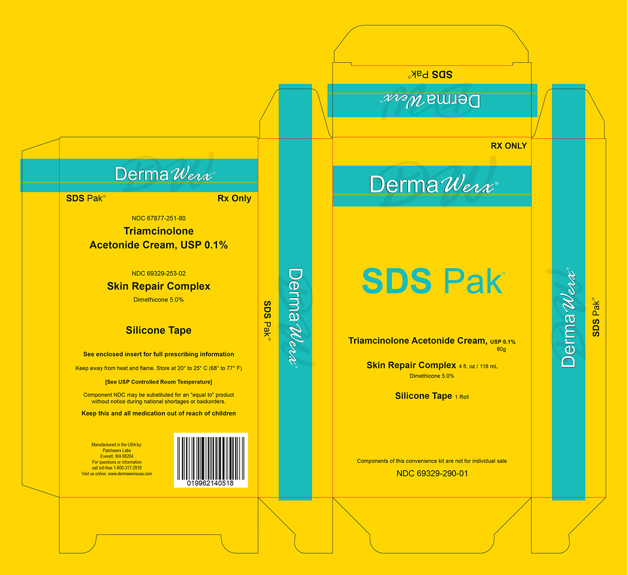 This is a prescription product called SDS Pak designed for skin care. It includes Triamcinolone Acetonide Cream which is a topical corticosteroid, Skin Repair Complex which contains Dimethicone, and Silicone Tape. The pack comes with a patient insert with all the usage information. It is advisable to store it at room temperature and away from heat and flame. The NDC may be substituted with an "equivalent" product based on availability during back-orders. The product is not suitable for individual sale as it is a convenience kit.*
