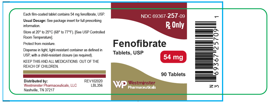 The following 3 images provide visual information about the product associated with Fenofibrate NDC 69367-257 by Westminster Pharmaceuticals, Llc, such as packaging, labeling, and the appearance of the drug itself. This resource could be helpful for medical professionals, pharmacists, and patients seeking to verify medication information and ensure they have the correct product.