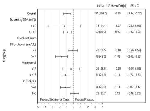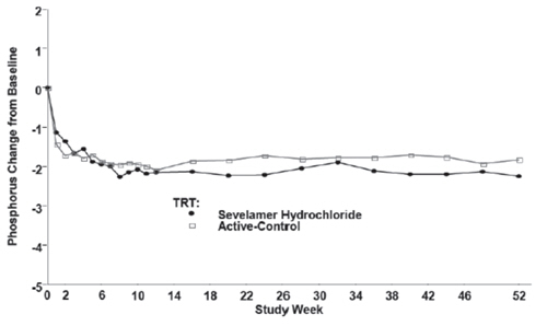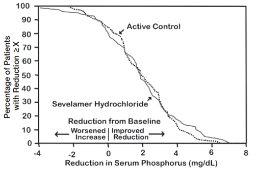 This text provides information about the percentage of patients experiencing a 2x reduction in serum phosphorus levels when treated with Sevelamer Hydrochloride compared to an active control. The data indicates the impact of the medication on reducing serum phosphorus levels from baseline.*