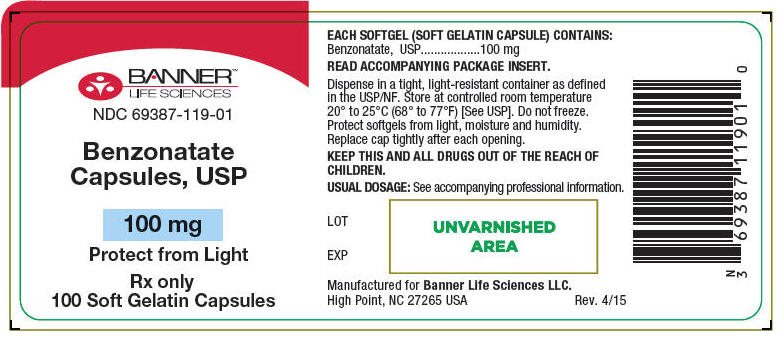 The following 3 images provide visual information about the product associated with Benzonatate NDC 69387-119 by Banner Life Sciences Llc., such as packaging, labeling, and the appearance of the drug itself. This resource could be helpful for medical professionals, pharmacists, and patients seeking to verify medication information and ensure they have the correct product.