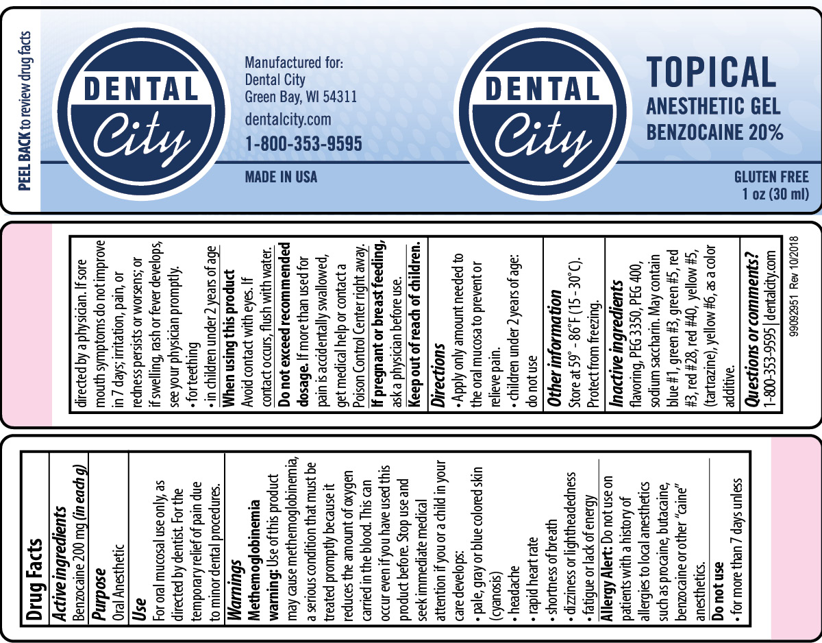 This is a description of a Gluten-free, benzocaine 20% topical anesthetic gel. It is 10z (30ml) and is manufactured in the USA by dentalcity.com for Dental City. The phone number is 1-800-353-9595, the address is Green Bay, WI 54311. The rest of the text appears to be garbled and illegible.*