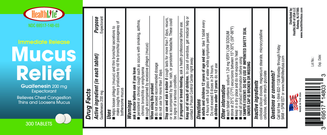 The following image provide visual information about the product associated with Guaifenesin 200mg NDC 69517-148 by Healthlife Of Usa Llc, such as packaging, labeling, and the appearance of the drug itself. This resource could be helpful for medical professionals, pharmacists, and patients seeking to verify medication information and ensure they have the correct product.