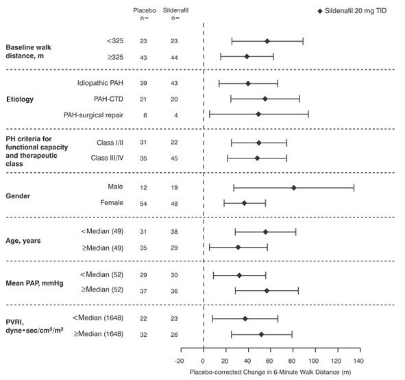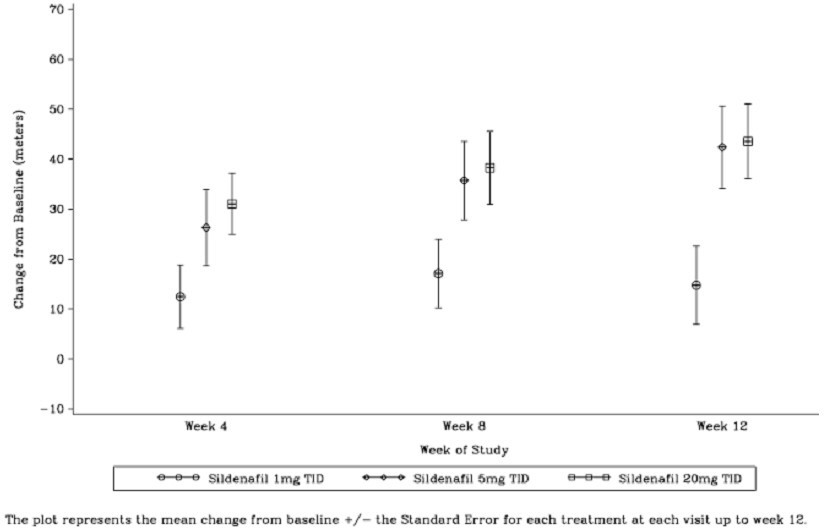 This is a graph that shows the mean change from baseline in meters (+/- standard error) for each treatment at each visit up to week 12. The treatments compared are Sildenafil ImgTID, Sildenafil SmgTID, and Sildenafil 20mg TID. The X-axis represents the week of the study with visits at week 4, week 8, and week 12.*