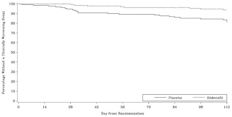 This text seems to be a table with information about clinical worsening events in patients treated with Sildenafil and Bosentan for Pulmonary Arterial Hypertension (PAH). The table displays the number of participants who experienced clinical worsening events as their first event or any event. The clinical worsening events documented include death, lung transplantation, and hospitalization due to PAH. Additionally, the table provides information on clinical deterioration resulting from a change of Egospostenc dose or termination of Bosentan. The proportion of participants who worsened is given, along with a 95% confidence interval. Overall, the text provides statistical data related to PAH treatment with Sildenafil and Bosentan.*