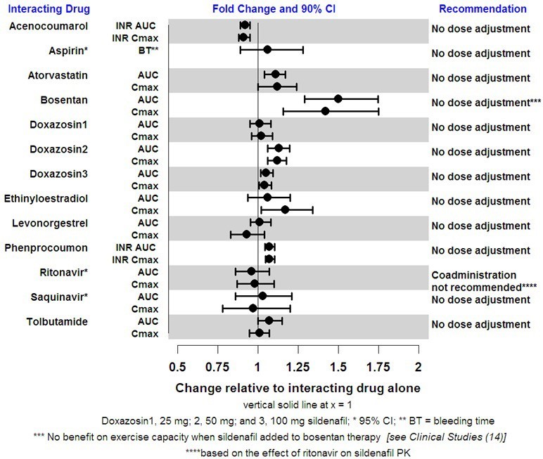 This is a drug interaction chart that provides recommendations for drug dosage adjustments. The chart includes different drugs such as Atorvastatin, Azithromycin, Cimetidine, Erythromycin, Maslox, Oral contraceptives, Ritonavir, and Saquinavir. The graph also includes a line graph that is used to compare the effectiveness of the drugs concerning Sildenafil alone. The chart also gives additional information such as 90% confidence interval, recommended dosage adjustment, and the benefit of using Sildenafil in combination with bosentan therapy.*