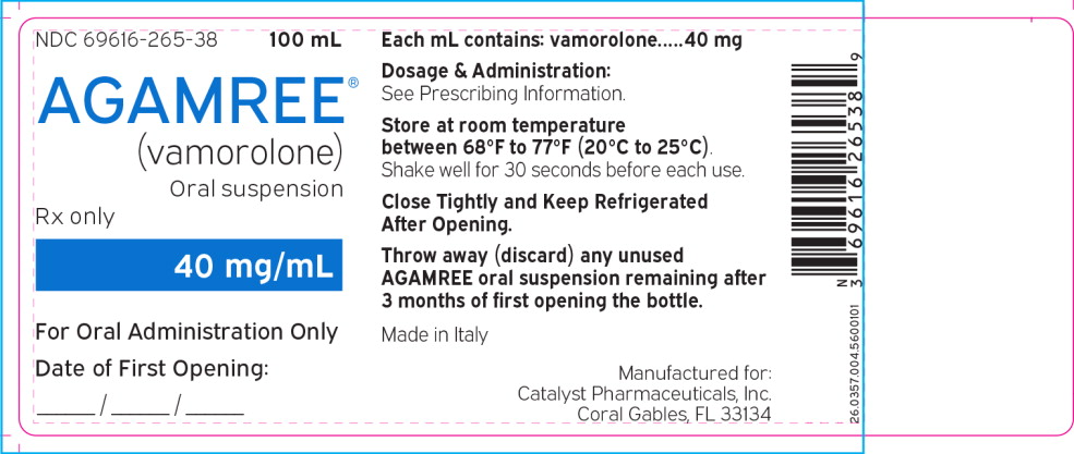 This text provides information about a medication called vamorolone, which is available in a 100 mL oral suspension. Each mL of the suspension contains 40 mg of vamorolone. The recommended dosage and administration instructions are not provided in the text, and it suggests referring to the prescribing information for more details. The medication should be stored at room temperature, between 68°F to 77°F (20°C to 25°C). Before each use, the bottle should be shaken well for 30 seconds. Once opened, the oral suspension should be tightly closed and kept refrigerated. Any unused oral suspension remaining after 3 months of opening the bottle should be discarded. The medication is manufactured in Italy for Catalyst Pharmaceuticals, Inc. located in Coral Gables, FL 33134.*