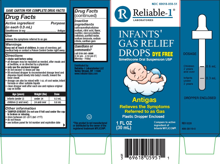The following image provide visual information about the product associated with Infants Gas Relief Drops NDC 69618-059 by Reliable 1 Laboratories, such as packaging, labeling, and the appearance of the drug itself. This resource could be helpful for medical professionals, pharmacists, and patients seeking to verify medication information and ensure they have the correct product.