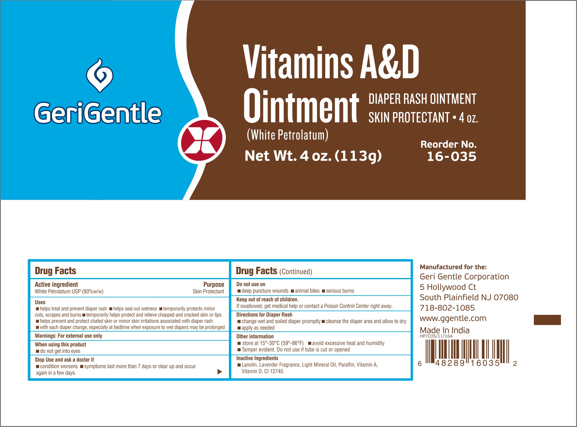 This is a drug facts label of a diaper rash ointment produced by Geri Gentle Corporation. It contains White Petrolatum USP as an active ingredient and Vitamins A&D as a minor ingredient. It is a skin protectant that helps prevent diaper rash and chafed skin. It temporarily protects minor cuts, scrapes, and burns as well as chapped and cracked skin or lips. It should not be used on deep puncture wounds, animal bites, or serious burns. The label provides directions for diaper rash, as well as warnings such as keeping it away from children and not getting it into the eyes. The ointment includes inactive ingredients such as Lanolin, Lavender Fragrance, and Light Mineral Oil, with a net weight of 4 oz. If the tube is cut or opened, it is not recommended to use. The product is manufactured in India.*