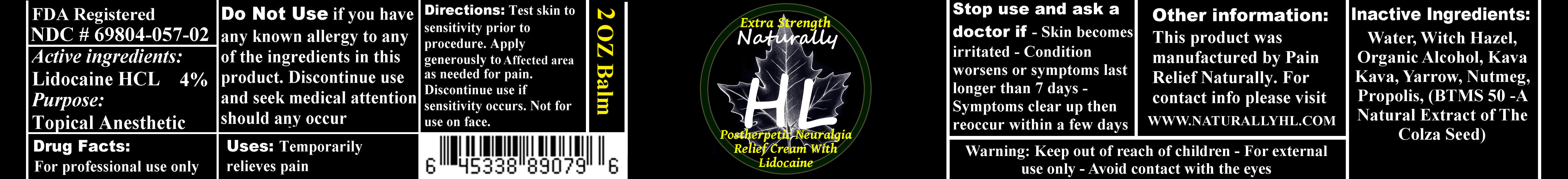 This is a drug label for a topical anesthetic product that contains 4% Lidocaine HCL. It is used to temporarily relieve pain, but should not be applied to the face or used on anyone with a sensitivity to its ingredients. The product is not for professional use only, but care should be taken to avoid contact with the eyes, and it should be kept out of the reach of children. Inactive ingredients include water, witch hazel, organic alcohol, kava, yarrow, nutmeg, propolis, and BTMS 350-A. If skin irritation persists or worsens after 7 days of using the product, or if symptoms clear up and then reoccur within a few days, the user is advised to stop using it and contact a doctor. More information can be obtained at www.naturallyhl.com.*