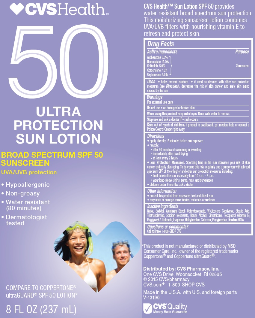CVS Healthâ„¢ Sun Lotion is a water-resistant sunscreen lotion that provides broad-spectrum sun protection of SPF 50. It contains UVA/UVB filters to protect the skin from the sun and nourishing vitamin E. The product is hypoallergenic, non-greasy and moisturizing. The directions state to reapply after 80 minutes of swimming or sweating. It is formulated to protect the skin from skin cancer and early skin aging. This product is for external use only, and it should not be used on damaged or broken skin. If product is swallowed, get medical attention. Distributed by CVS Pharmacy, it comes in an 8 FL oz (237 mL) package and carries a money-back guarantee.*