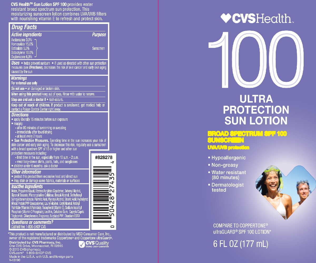 CVS Health Sun Lotion SPF 100 provides water-resistant broad-spectrum sun protection by combining UVA/UVB filters and vitamin E. It helps prevent sunburn and decreases the risk of skin cancer and premature skin aging caused by the sun. The sunscreen should be applied 15 minutes before sun exposure and reapplied every 80 minutes of swimming or sweating, immediately after towel drying, and at least every two hours. Spending time in the sun increases the risk of skin cancer and early skin aging. The product should be kept out of reach of children and should not be applied to damaged or broken skin. Additionally, it must be kept out of the eyes and rinsed with water in case of contact. The sunscreen lotion is hypoallergenic and non-greasy, and it is suitable for dermatological use. It comes in a 6 FL0Z (177 mL) container and is distributed by CVS Pharmacy, Inc. It is not manufactured or distributed by MSD Consumer Care, Inc., owner of the registered trademarks Coppertone and Coppertone Ultra Guard.*